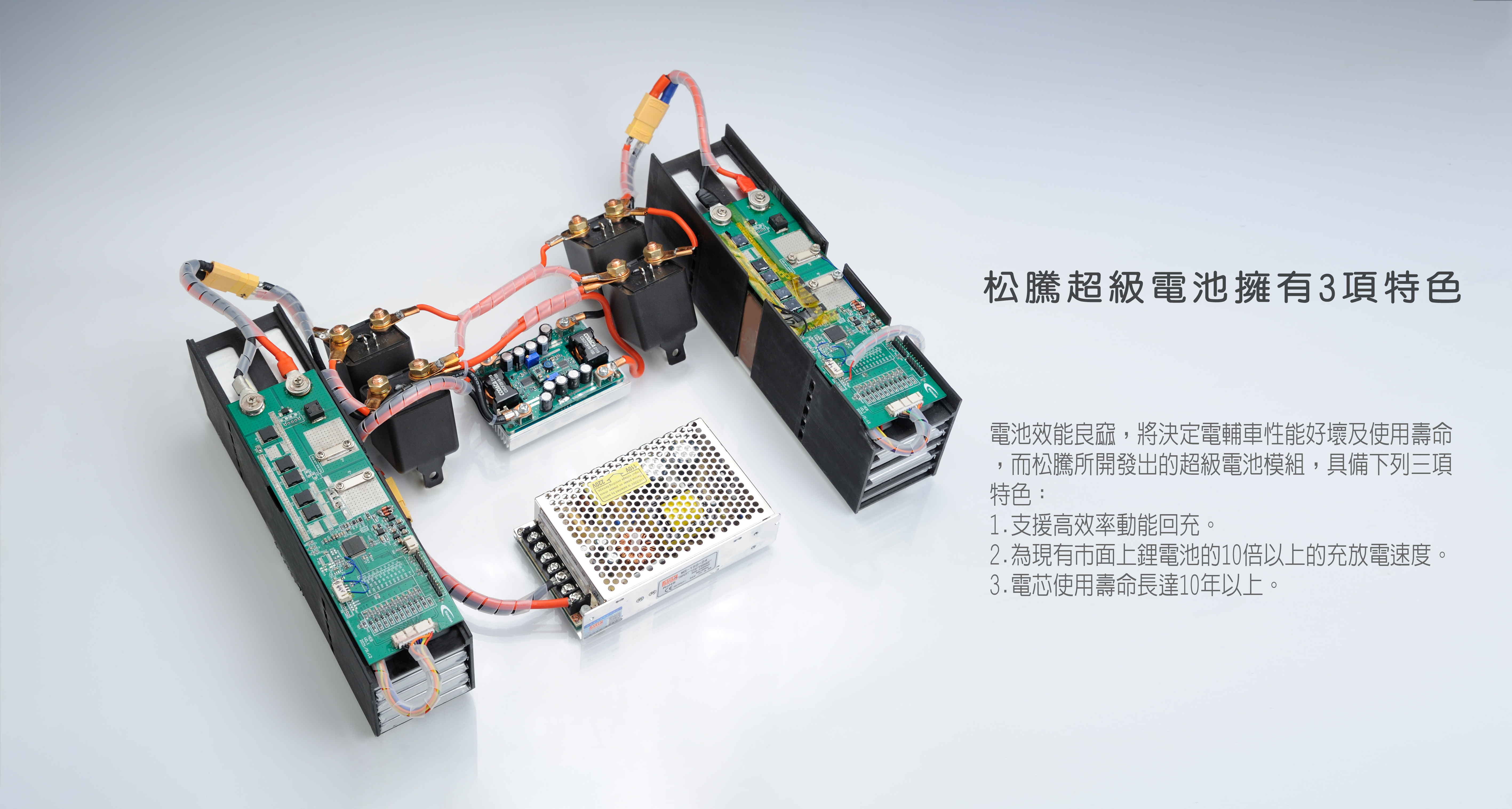 「動能回收系統(KERS, Kinetic Energy Recovery System)」,克服技術限制,可將下坡時的動能回收轉為電能,不僅可以增加下坡的安全性同時高效率轉將位能轉換為電能、結構精緻、體積重量小、工作溫度範圍廣、安全性高且使用壽命長,為松騰電輔車開創一條永續騎乘的里程碑。